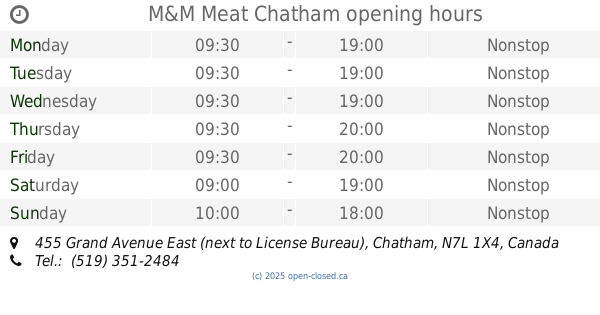 It is also possible to : Edit these OPENING HOURS of Store M&M Meat In Chatham, 455 Grand Avenue East (next to License Bureau),